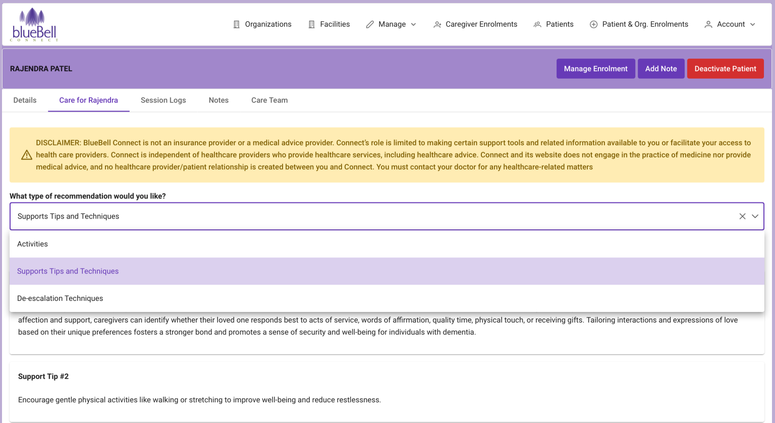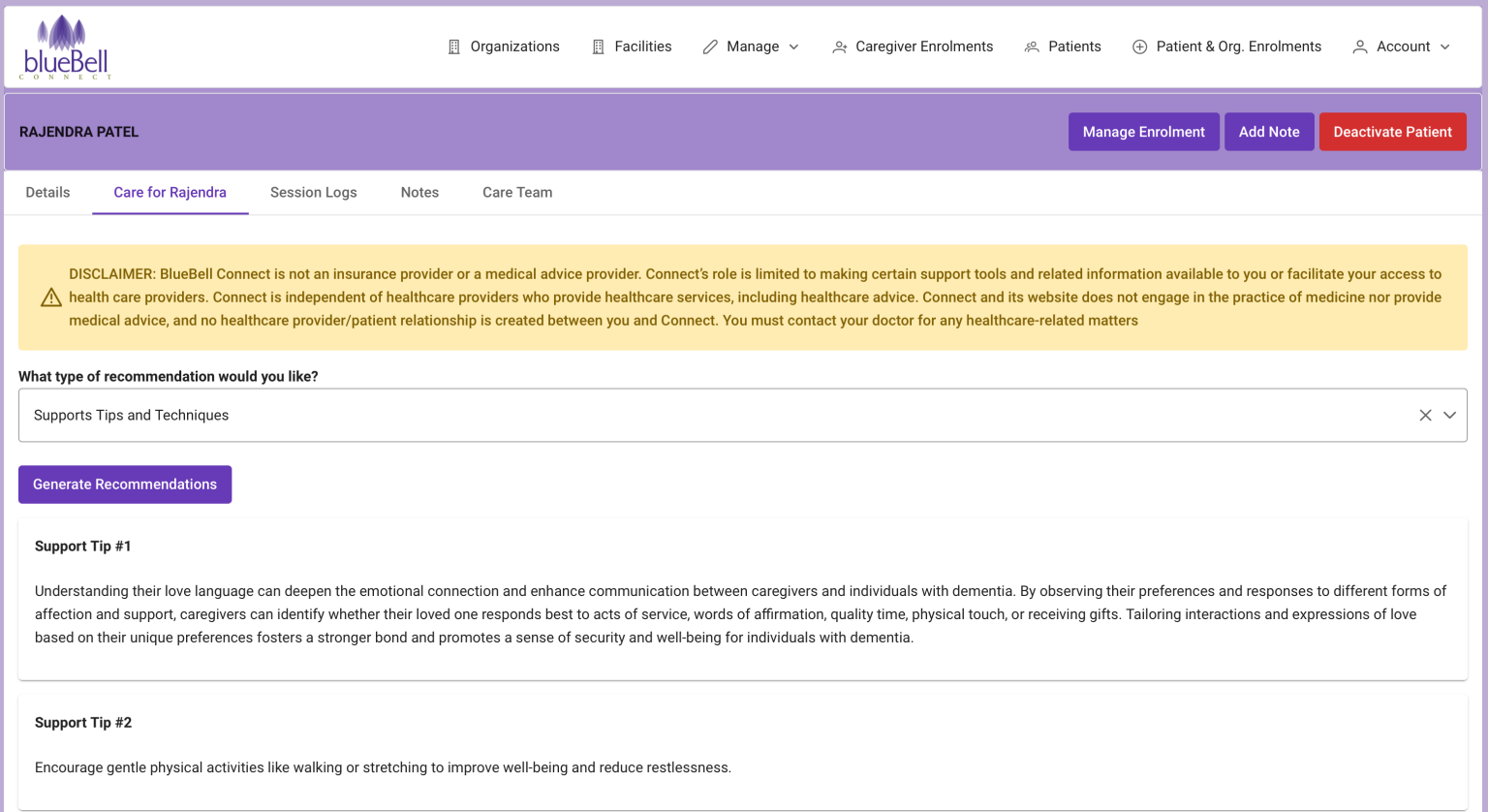blueBell Connect provides personalized dementia care recommendations that are clinically grounded, personally specific, and culturally appropriate. The system considers the individual’s history, preferences, behaviors, and evolving needs to generate guidance that feels relevant to the real situation at hand.