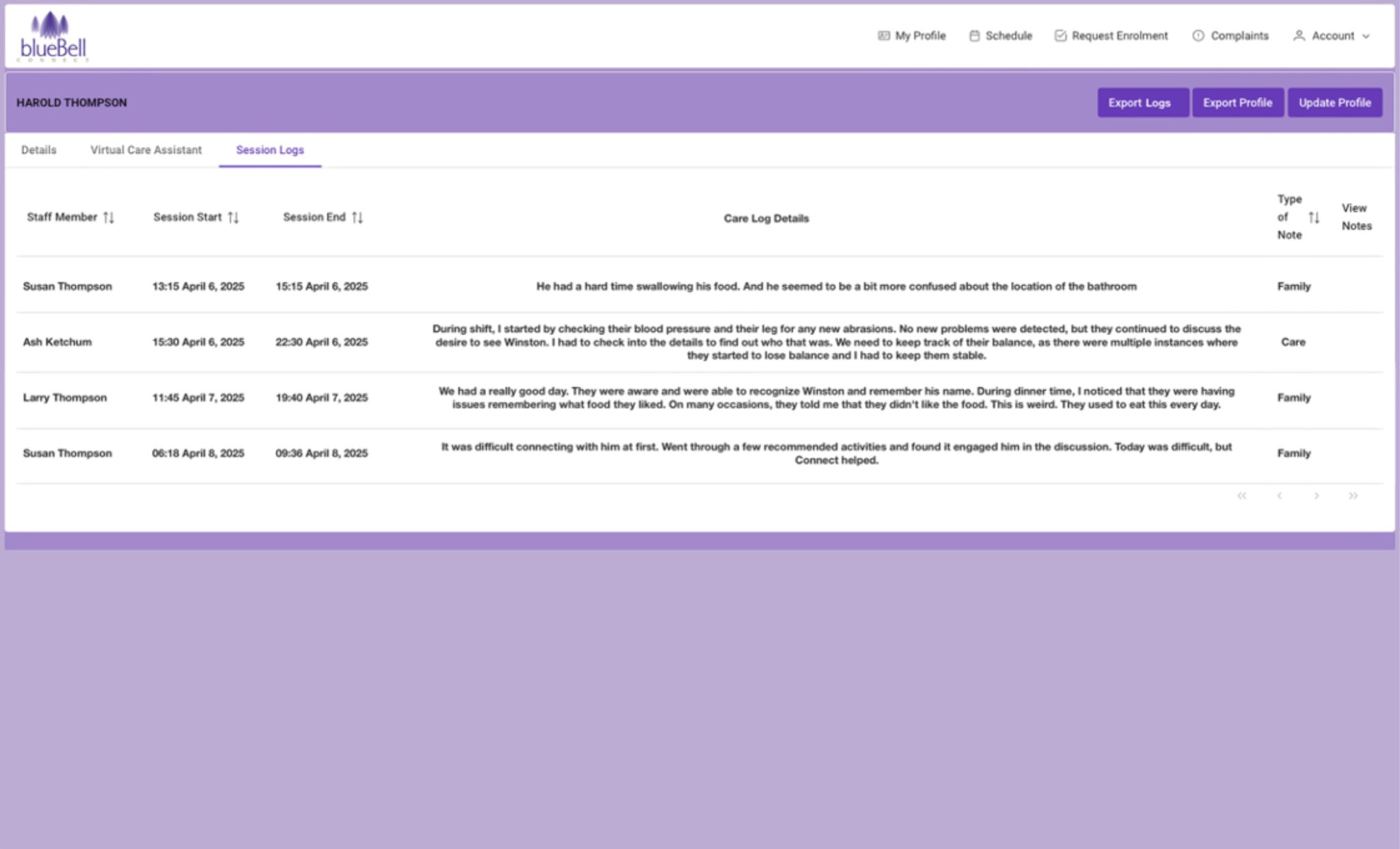 blueBell Connect allows multiple caregivers to document care sessions in one secure location. Behaviors, physical changes, mood patterns, interventions, and outcomes can be recorded consistently across the care team. As entries accumulate, families begin to see patterns that would otherwise remain invisible.